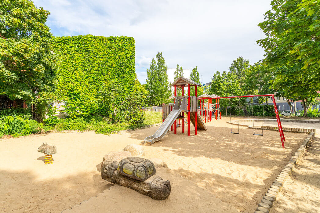 Jede Wohnung verfügt über einen Balkon oder eine Terrasse. Die Erdgeschosswohnungen erhalten neben der Terrasse zusätzlich einen Vorgarten in Richtung des begrünten Innenhofs. Für die Kleinen gibt es dort einen Spielplatz.